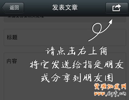 點擊“發(fā)表文章”選項,進入文章編輯界面。輸入文章標題和文章內(nèi)容,最后填寫文章署名,點擊“發(fā)送”按鈕。之后會收到點擊界面右上角按鈕進行分享的提示。