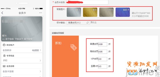 7.會員卡設置:(針對無線端)設置領卡等級,會員基礎領卡等級,設置后即該等級及以上的會員都可領卡;不同等級的會員領取的卡是不同的,領取的是對應等級的卡,即普通會員-銀卡,高級會員-金卡,VIP會員-白金卡,至尊VIP會員-鉆石卡;