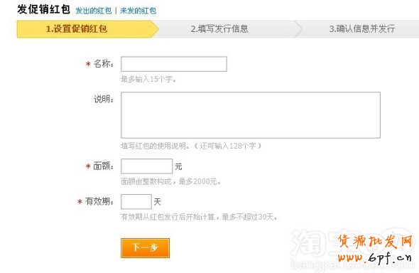 ,上面的名稱就是填你的客戶會員名,面額應該不用我說了,就是紅包的金額,自己定,3元,5元,都可以,按自己店產品的實際情況訂,有效期記得最多不超過30天哦,30天后如果客戶沒有使用該紅包,錢還是會回到您的帳戶的,填好了以后點下一步