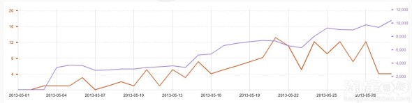 如意投的操作,本人更多的覺得,應該是在前期,而不是后臺,目前很多人關注的只是后臺,每天有多少PV,有多少點擊,引入付款多少,結算多少,我覺得這個應該要關注,但不是最主要的.做如意投,目前來說,可以參考鉆展的測試計劃,因為你不知道別人出多少價格,多少傭金,所以需要你不斷的去調整,去統(tǒng)計分析.但是如意投因為是站外的關系,所以這個測試周期可以去適當?shù)姆砰L一點,我花了一個月時間,調整了3次傭金.從開始的5%,到中間的10%,到現(xiàn)在的15%,我發(fā)現(xiàn)每一次調整,PV都會有明顯變化,但是點擊量沒有明顯變化,但是因為目前我的計劃是不超過15%(據(jù)我自己了解,目前我這個類目的,大部分淘寶客的傭金都是在10%左右),所以再后面我沒有去調整傭金率,而是去修改主圖,修改詳細描述(標題暫時不去動,因為動了標題會和搜索排名有關系).每次調整間隔大概在8-9天左右,前面?zhèn)蚪鸬偷臅r候調整周期稍微快了一點,因為5%的傭金再怎么說也不可能有大的展現(xiàn)量.PV從開始的每天大概2000左右,上升到每天大概9000左右,我的第一筆如意投成交發(fā)生在5月22號,當時的傭金率是15%,PV在6000多,后來繼續(xù)優(yōu)化主圖,23號之后每天都會有成交,但是量不大.都至少,說明我的操作有效果出來了.下圖是我近一個月的數(shù)據(jù)統(tǒng)計,很明顯的都是在往上升,只不過起伏有點大: