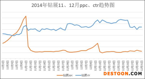 從10中下旬開始,我們的cpc、cpm一路高漲,在雙11達到峰值,雙11后很多客戶受限于產品、發貨等自身因素,不得不停止投放。而直通車、鉆展作為競價平臺,參與競價的客戶少,引流成本自然會下降,尤其是那些雙11期間對引流成本望而卻步的中小商家,此時正是大展拳腳的機會。