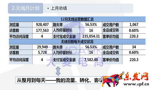 首先我們要做一張表格,去拆分我們的數據。把無線端的數據從整月到每天,流量、轉化、客單,都要仔細分析但是,僅僅做無線端的分析還是不夠的。我們不能只看局部。還要結合全店的數據來評估。例如,全店都在上升的情況下,我們不能說無線端就做的非常好,也不能一味得批判效果,還是要結合全店,做全方位的分析。我們通過分析數據對比,可以得出下個月店鋪運營的的重點。在針對優缺點去安排工作重心。