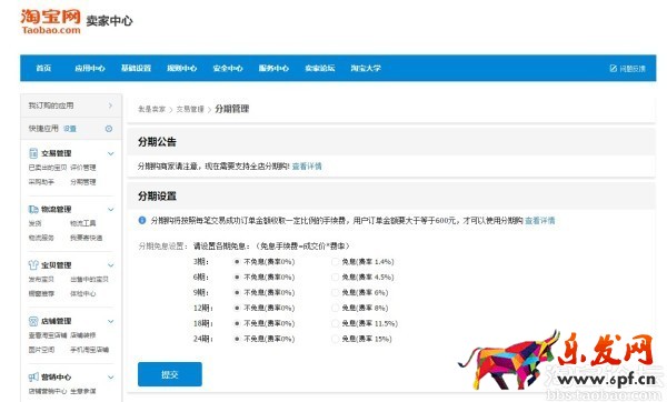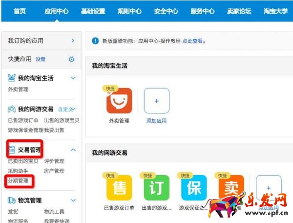 設置方法:1)首先需要訂購花唄的商家才可使用,否則設置界面無法使用;2)賣家需要打開新版賣家中心,如下圖顯示,點擊應用中心,選擇交易管理,選擇分期管理應用