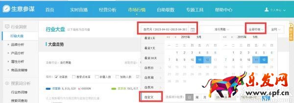 首先,市場行情大部分地方的數據在時間段選擇上提供:1天 7天 自然日 自然周 自然月 自定義時間;在平臺上分為淘寶、天貓和全網;終端上分PC端、無線端和全部終端。也就是說,市場行情提供了目前為止最全面的無線行業數據。市場行情絕大部分地方提供三年的行業數據供分析參考