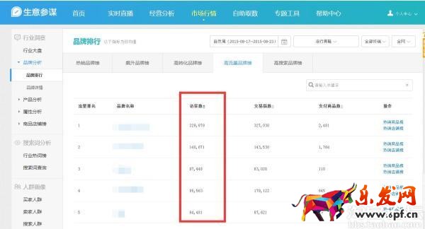 這里重要的數據就是訪客數,可以在搜索框里找到自己品牌,然后看自己的訪客,也可以直接看行業的排名,也是可以看到他們的熱銷店鋪和寶貝,可以多參考,多學習。