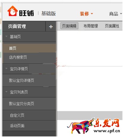 與上述新版旺鋪相比,2012舊版的旺鋪,其裝修后臺首頁的頂部旺鋪標志背景是灰色的,左側顯示的內容只有基礎頁、首頁、店內搜索頁和寶貝詳情頁等而已。(如下圖所示)