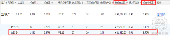 以上為過去30天主推寶貝搜索受眾投放的數據情況,由于臨近雙十一,轉化會呈現下滑,過去30天的數據更具代表性,可以看出”女30-34”人群的投放,通過年齡及客單價的圈定,該人群促進的成交金額多且轉化率較高,可以通過人群的溢價比例調整來提升該人群的流量,人群的圈定有利于提升流量的精準性來促進轉化。