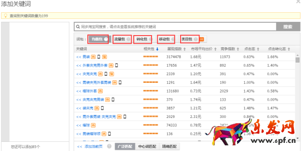 系統(tǒng)將從不同的維度推薦的關(guān)鍵詞分為5個(gè)詞包,為均衡包、流量包、轉(zhuǎn)化包、移動(dòng)包、類目包。
