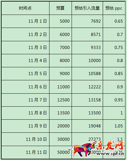 該賬戶為童裝賬戶,平時(shí)直通車花費(fèi)在5000左右,ppc為0.65,雙十一當(dāng)天的預(yù)算是5w,這里主要是在原先直通車的基礎(chǔ)上預(yù)估從11月1日到11月11日,每天的流量預(yù)估與預(yù)算。