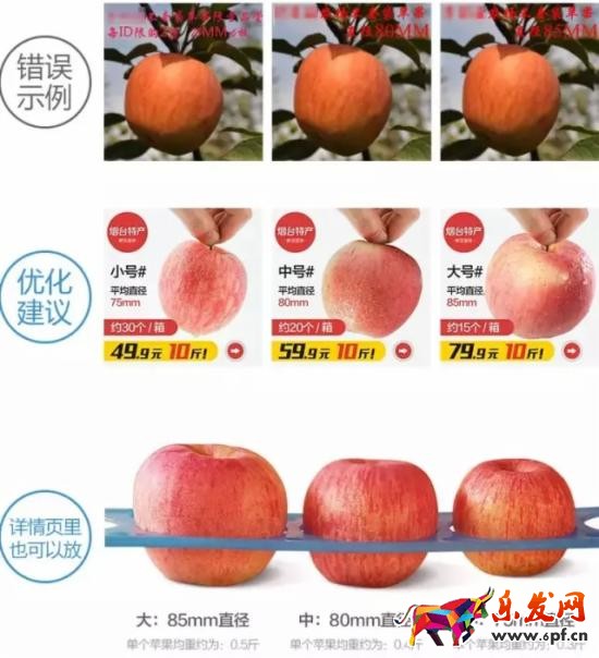 同時發現蘋果還分大小號,但是沒有明顯的對比參照物,更有的甚至直接用了同一張圖代表了,殊不知,這既不方便買家挑選。還讓選擇困難癥的人更加犯難...