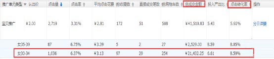 以上為過去30天主推寶貝搜索受眾投放的數據情況,由于臨近雙十一,轉化會呈現下滑,過去30天的數據更具代表性,可以看出”女30-34”人群的投放,通過年齡及客單價的圈定,該人群促進的成交金額多且轉化率較高,可以通過人群的溢價比例調整來提升該人群的流量,人群的圈定有利于提升流量的精準性來促進轉化。