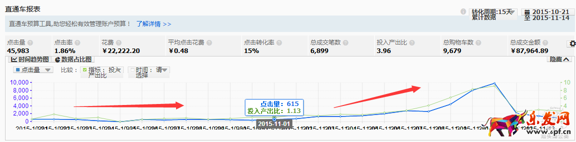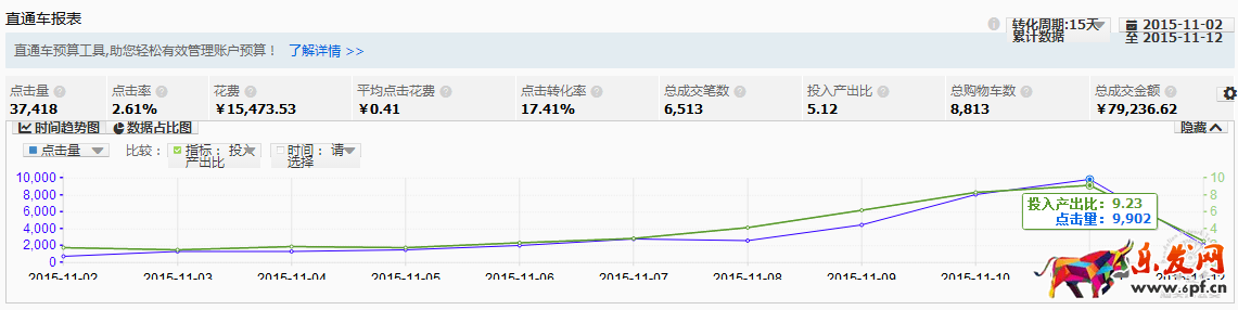 從10月份中旬才開始側重逐步培養,前期通過引流測款后,在11月份開始就逐步加大力度重點款寶貝,11月份后流量逐步上升,且在流量上升的情況下轉化也是一路提升的,在雙11當天更是引爆了直通車。