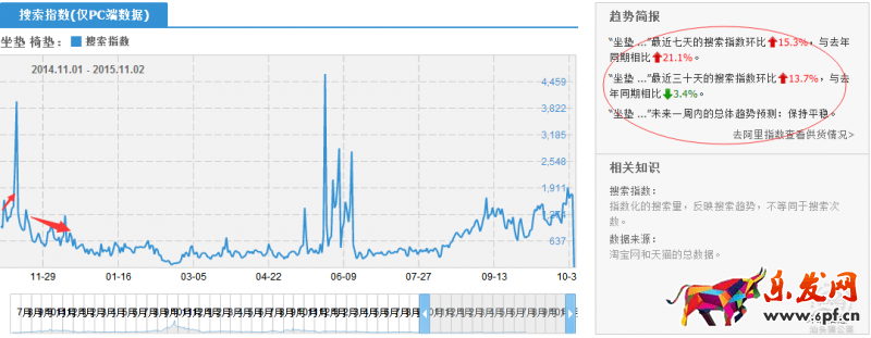 淘寶指數查看在2014年11月份至今的數據可以看出”坐墊 椅墊”類目行業搜索在11月份后會開始逐步上升,11月下旬有下滑的趨勢,持續到1月份中旬較穩定。抓住這一行業的特性,在11月份的時候直通車開始加大引流測試,迎合行業雙11高峰期的到來。