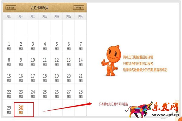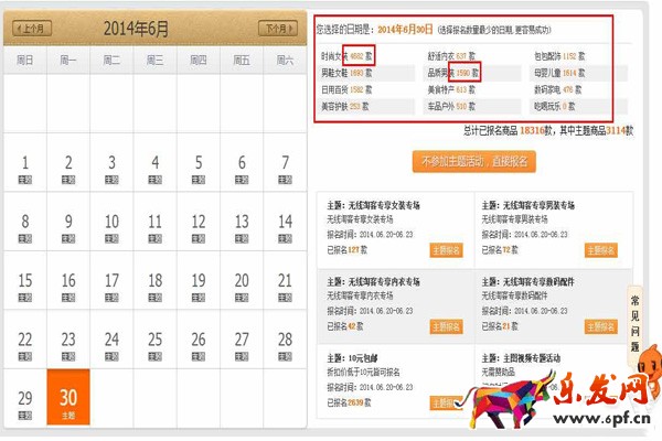 當賣家進行天天特價報名時,網(wǎng)頁會彈出一個選擇報名日期的窗口,賣家可以點擊日期查看報名詳情,只有橙色的才能報名,如下圖。