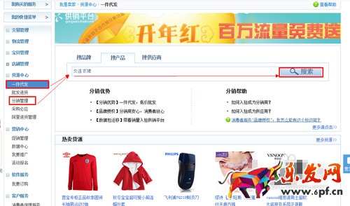 2、在貨源中心頁面,可選擇一件代發或分銷兩種模式,確定好模式后,在搜產品中,尋找貨源。