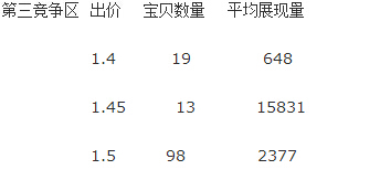 出價0.6的時候 206個寶貝 平均展現189 按照總展現量計算 38934。例如一個優質寶貝詞占3W的展現了 剩下的8000多個展現分給剩下的205個寶貝 一個展現30多個 這一算還真的比較符合事實,不信各位掌柜可以看看直通車后臺,那問題來了,都200多個寶貝跑過去沒水喝啦 ,你準備一個新寶貝也去展現40個嘛。 所以 這就是為什么先看好1.4——1.45區間 2——2.15的區間考慮, 那你這同樣還是面臨被優質寶貝排擠的威脅啊,記住 優質寶貝會在獲取足夠的流量空間的低價土壤下生長,或者在往上擴張,擴大市場占有率,出高價。 對于中間價位展現居中寶貝量少的才是新寶貝的首選。 至于精準的出價多少希望各位親自己測試計算,價格是浮動的因為你今天出價1.4 那你昨天出價的1的位置就會減少,同樣出價1.4的人也會增多,關注好實時數據,按照區間價位從第三寶貝競爭區域向第一寶貝競爭區域靠攏。