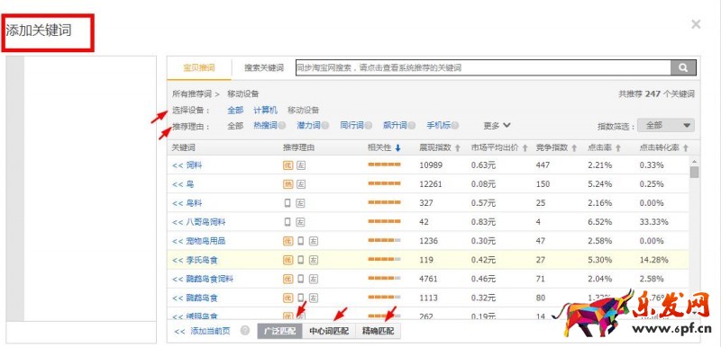 1、系統推薦的詞(直通車后臺添加關鍵詞后,系統會做一些相關推薦,我們經常會按照匹配程度和相關性進行選詞)
