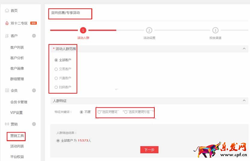 在營銷工具里面的定向優惠專項價,選擇打開,根據里面的提示選擇活動人群范圍,并針對我們分析出來成交最集中的人群特進行選擇,確認活動推送的人群后,進行活動的相關設置,包括活動名稱、活動時間、參與活動的寶貝和具體的寶貝活動價格,活動名稱的吸引度關系到客人是否打開推送在他賬戶的活動,所以活動名稱方面,必須新穎,吸引人的眼球。