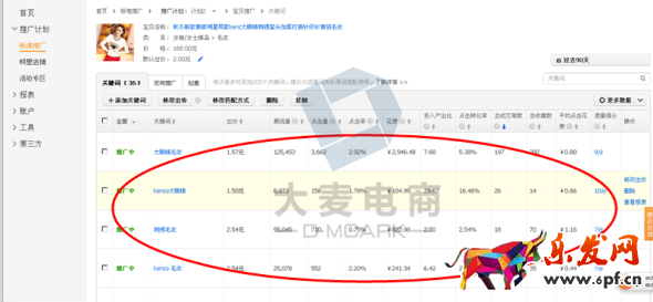 該女裝店是一家新起步的淘寶賣家,和姊妹一起經營了2家淘寶店,主要經營時尚明星同款系列情侶毛衣類目,月營業額在60萬以上/店,主要推廣方式是直通車,產品定位是18—25歲年齡段的大學生群體。該店主推產品時尚毛衣客單價是128元,雙十一前后90天展現量423萬,點擊量15714,直通車點擊率在0.37% 直通車轉化率3.48% 直通車投產比3.38 直通車成交筆數547,平均PPC 1.21 收藏數1110,大促前日平均出單量200件/店。