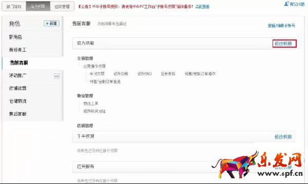 點擊角色權限——修改權限,進入之前設置的售前客服管理權限,點擊修改。
