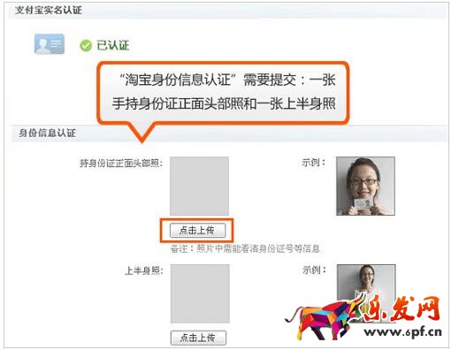 二、“淘寶身份信息認證”需要提交:一張手持身份證正面頭部照和一張上半身照,點擊上傳;