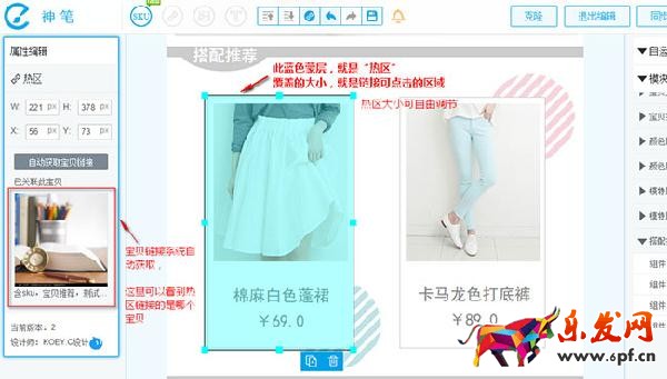 4、選擇完寶貝,就會出現(xiàn)一個藍色的蒙層,這就是“熱區(qū)”,覆蓋的大小就是鏈接可點擊的區(qū)域,熱區(qū)大小可自由調(diào)節(jié)