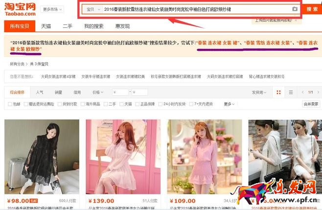 因為你搜的是全關鍵詞,搜索的結果很少,所以,淘寶就給你指定了關鍵詞,這里指定的就是“春裝 連衣裙 女裝 裙”、“春裝 雪紡 連衣裙 女裝”、“春裝連衣裙 女裝 歐根紗”。