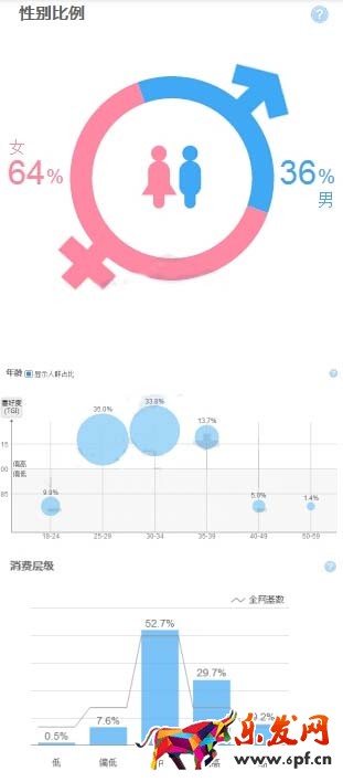 從數(shù)據(jù)可以看出,該童裝店的人群定位主要是以女性消費(fèi)者為主,占比為64%,男性也占比為36%。在年齡劃分來看,店鋪的消費(fèi)者年齡跨度比較大,從18-59都有,而處在25-29,30-34歲區(qū)間的人群為最核心人群。 從消費(fèi)層級來看,店鋪人群的消費(fèi)水平屬于中等偏高的水平。