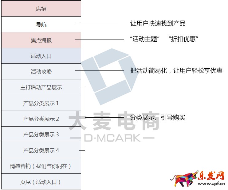 在雙11期間,我們落地頁(yè)的主要作用是介紹雙11優(yōu)惠活動(dòng),將盡快的將流量分流到合適的位置,促使用戶成交。那么我們落地頁(yè)的布局應(yīng)該有的模塊有:店招,焦點(diǎn)海報(bào),活動(dòng)攻略,主打產(chǎn)品,產(chǎn)品地圖,產(chǎn)品分類展示等。按照重要性,從上到下排列,如下圖: