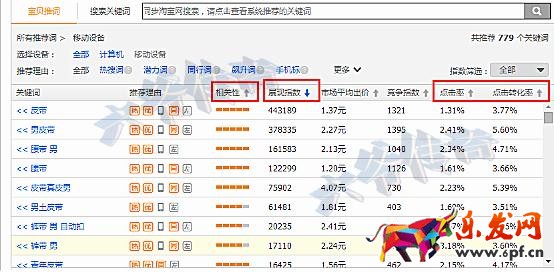 相對簡單、方便,參考性強的選詞方法,可根據系統推薦結果的相關性、展現、點擊率、轉化率來選擇相關關鍵詞。