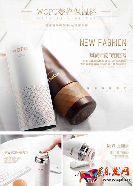 將產品賣點進行文案的提煉,統一出能貫穿所有賣點的關鍵字,再進行潤色處理,如下圖將產品的賣點“風尚‘菱’度距離”、”體驗繁瑣歸‘菱’“、”設計‘菱’巧貼心“,很好地將杯型的菱格與每個賣點進行文案的結合,巧妙且恰到好處。