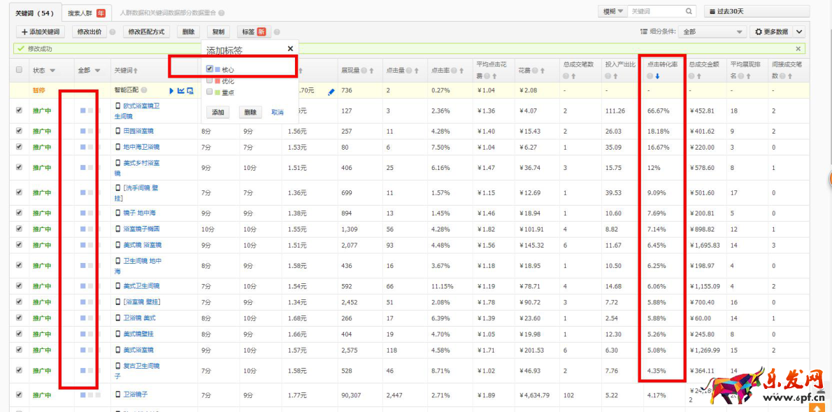 當需要調整三類詞某一類詞的時候,比如保障詞,僅僅用標簽工具,選擇藍色核心那么下面出來的詞,全都是保障詞,這樣就可以對保障詞進行批量操作,達到你想要的效果。