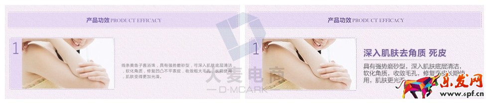 一個好的排版布局,可以增加頁面的整體美觀,使文字更加易讀,為用戶帶來更好的體驗。常見的一些較好的布局排版方式有:通過左圖右文,左文右圖,以文字作為主體產品為裝飾等方式。通過這些排版方式,使得文字更為清晰易讀,跟圖片也結合得更為緊密。讓用戶有一個舒適的視覺體驗,增加點擊轉化率。如下: