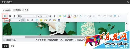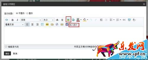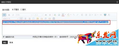4、編輯自定義內容區,并插入圖片,將之前復制好的圖片代碼粘貼進圖片地址,點擊確定