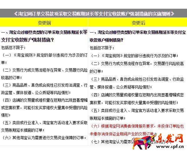 3、《淘寶網(wǎng)訂單交易款項采取交易賬期延長等支付寶收款賬戶強(qiáng)制措施的實施細(xì)則》中,新增適用賬期保障的情形“根據(jù)淘寶網(wǎng)消費(fèi)者保障服務(wù)要求,未投保訂單險也未繳存消保保證金期間產(chǎn)生的交易訂單” 。