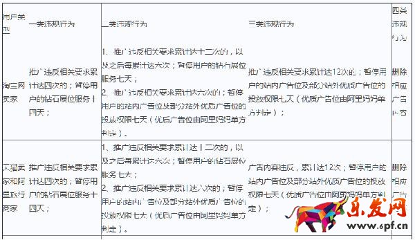 二十五 用戶因違反《淘寶規則》、《天貓規則》或《阿里旅行規則》被處罰的,阿里媽媽除采取本規范第二十三條規定的措施外,同時有權依違規類型與扣分累計分值區間,按下表所列時間中止用戶的鉆石展位服務: