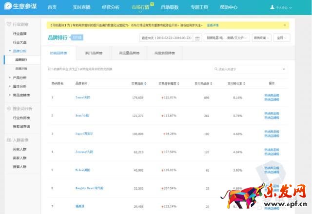 其二,我們可以用生意參謀查看成交用戶所在區域、成交熱門屬性、熱門品牌成交分布等,大致看一下當前類目有哪些熱銷品牌、我們是否有品牌優勢,然后進入品牌詳情看排行TOP3的品牌和競爭力相似的品牌。