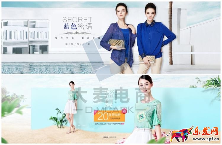 主題型海報是最常見的一種海報設計手法,營造出來的氛圍容易讓消費者產生共鳴。主題型海報就是圍繞文案的主標題設計海報。使背景、服裝、模特展現都圍繞著主題進行,相輔相成呈現一種獨有的氛圍。例如下面的兩張海報,第一張海報“藍色密語”,服飾是知性的都市白領著裝,所有背景采用藍色為主色,灰白為輔色,服飾都是藍色系列的,模特的形態展現出一種優雅、知性之美,使得海報與主題相輔相成,呈現出靜謐知性、藍色優雅的,一種時尚都市白領的感覺。第二張海報圍繞“盛夏”主題,服裝是飄逸仙氣的連衣裙,從主題中可以聯想到的是夏天、綠葉、沙灘、清涼、美女、自由等意境,海報背景采用是沙灘大海,淡淡的藍色調營造一種清涼舒適的感覺, 模特姿態也是表現出一種飄逸自在的感覺,與整個海報的格調相應襯托,突出盛夏的感覺。