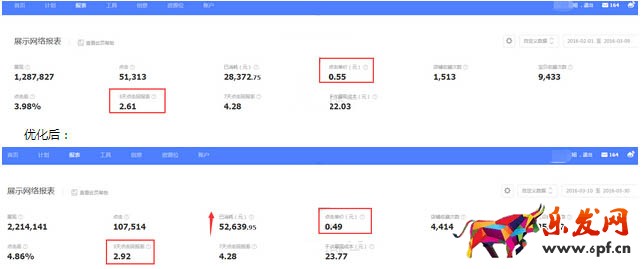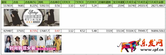 一家C店,主營韓版低價女裝,客單價在45元左右,目前店鋪等級為三金冠,主要運營思路是每天上新。鉆石展位每天消耗1000-2000元不等,點擊單價0.55元,3天點擊回報率是2.61,因店鋪特性,所以收藏量比較多,成交周期會比較長。現投放遇到瓶頸,點擊單價已經是低于行業值,ROI高于行業均值,不知如何突破。在定向已經精準的情況下,鉆石展位專員另找思路,突破這一瓶頸,那么專員是如何操作的呢?天貓代運營小編先給大家看下鉆石展位專員優化前后數據,如下圖: