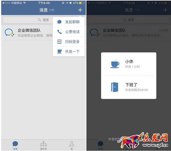 傳說中的“回執消息”、“休息一下”功能也沒有落下。“休息”功能可以讓員工在休息的時候不受打擾,而微信團隊設計這個功能的初衷也非常簡單: