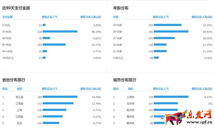 總的來說,通過生意參謀提供的結果,就可以大致勾勒出消費者畫像,搜索購買該品類產品的用戶性別、年齡、客單價以及地域的構成情況,可以形成這樣一張表格: