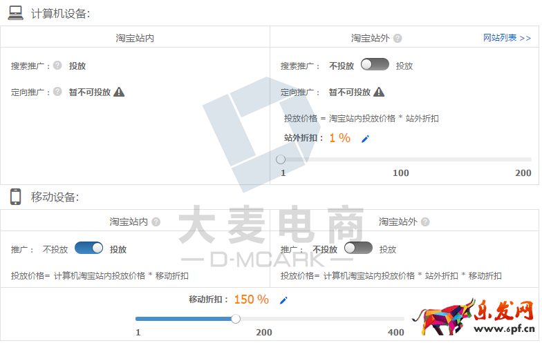 針對上面的情況,我們第一步先把PC和無線的站外平臺關閉,如果定向推廣能開啟的店鋪也建議先關閉,一般來說,這三個投放平臺總體上相比站內的點擊率會比較低,如果開啟會整體拉低整個計劃的點擊率。由于現在的無線端點擊率要比PC端的要總體高出不少,所以無線折扣方面暫時拉升到150%,如下圖。