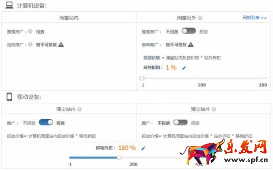 針對上面的情況,我們第一步先把PC和無線的站外平臺關閉,如果定向推廣能開啟的店鋪也建議先關閉,一般來說,這三個投放平臺總體上相比站內的點擊率會比較低,如果開啟會整體拉低整個計劃的點擊率。由于現在的無線端點擊率要比PC端的要總體高出不少,所以無線折扣方面暫時拉升到150%,如下圖。