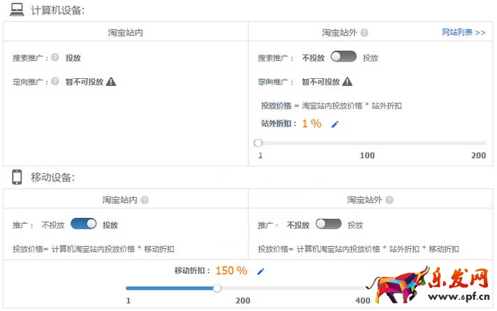 針對上面的情況,我們第一步先把PC和無線的站外平臺關閉,如果定向推廣能開啟的店鋪也建議先關閉,一般來說,這三個投放平臺總體上相比站內的點擊率會比較低,如果開啟會整體拉低整個計劃的點擊率。由于現在的無線端點擊率要比PC端的要總體高出不少,所以無線折扣方面暫時拉升到150%,如下圖。