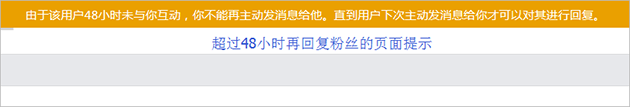 4、粉絲發(fā)送給公眾帳號(hào)消息的48小時(shí)內(nèi)未回復(fù)粉絲的消息,48小時(shí)后則無法再主動(dòng)發(fā)送消息給該粉絲,但如果下次該粉絲主動(dòng)發(fā)送消息給您,您則可以進(jìn)行回復(fù)。