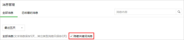 您好,隱藏關(guān)鍵詞消息功能的作用:勾選“隱藏關(guān)鍵詞消息”后,粉絲發(fā)來的關(guān)鍵詞消息則會(huì)隱藏掉,讓公眾帳號(hào)運(yùn)營者更方便人工回復(fù)用戶消息。