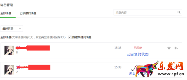 2、不支持手動(dòng)刪除粉絲發(fā)過來的消息,系統(tǒng)會(huì)保留最近5天的消息,超過時(shí)間的消息會(huì)自動(dòng)清空;