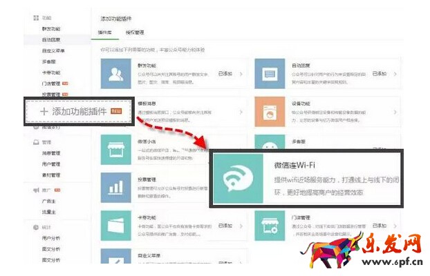商戶登錄公眾號進入公眾平臺管理界面,點擊界面左側“功能->增加功能插件”,在“插件庫”中選擇“微信連Wi-Fi”插件,騰訊官方表示,凡是獲得微信認證的微信公眾號都可以申請這個插件。見下圖: