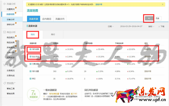 2、整體訪客情況較上一周期,呈上升趨勢,同時根據不同端口,了解目前店鋪的流量主要是哪部分占比較大,以及是店鋪的核心流量: