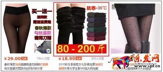很簡單,這也是非常重要的一個問題:賣點提煉,消費者能記住的實際上往往只有一個。這個首圖上至少兩個賣點是賣家想突出的:一個是加肥加大、一個是加絨加厚。但是你有沒有想過,很胖的妹子非常的想顯身材呢,加絨加厚好?本來腿就粗!所以,你到底想圍繞哪個核心,一定要明確。